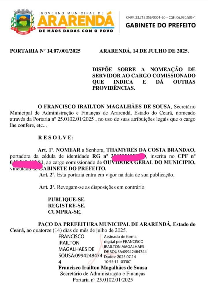 Prefeitura de Ararendá-Ce, em nome do Secretário de Administração e Finanças, Francisco Irailton Magalhães de Sousa, nomeou após 4 meses da saída de Tonka CDs, nova Ouvidora Geral Municipal.