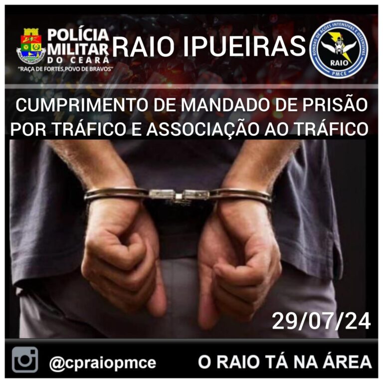 Na noite de segunda-feira (29) de julho de 2024, o BPRAIO da cidade de Ipueiras-CE deslocou-se até o município de Ararendá, onde em cumprimento a um mandado judicial prendeu na localidade de Veremos, uma mulher por associação ao tráfico de…